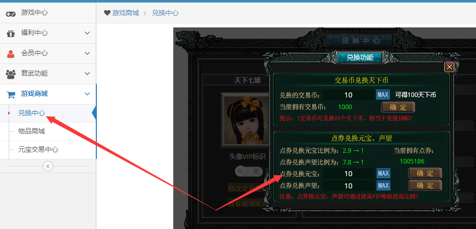 获得点券以后请通过以下方法兑换成元宝购买各类物品